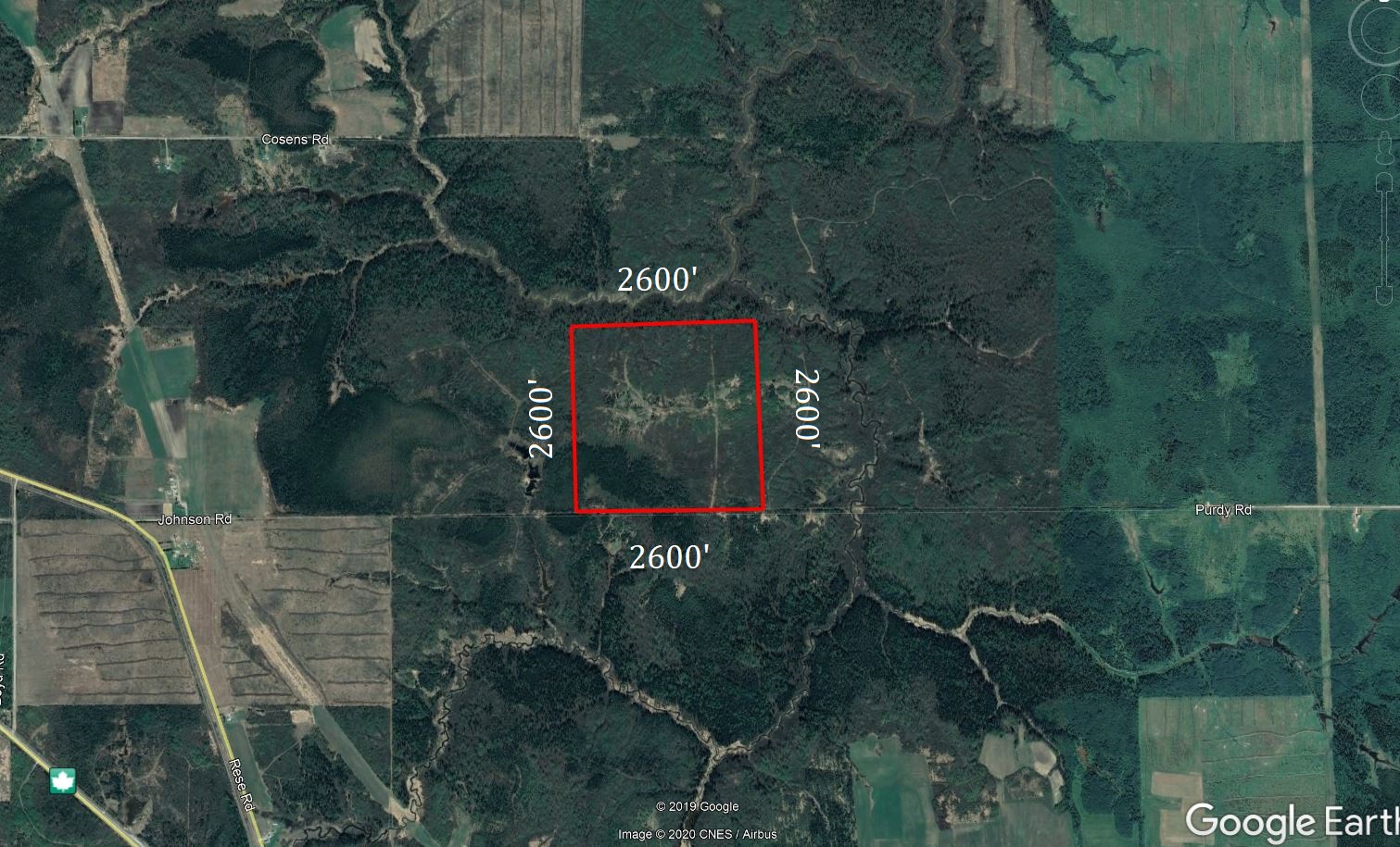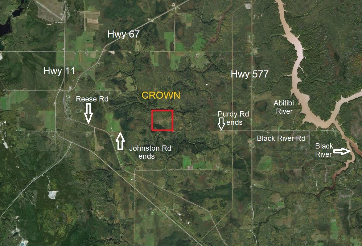 South Half Lot 5, Concession 6, Clergue Township, District of Cochrane, Ontario, 160 acres or 64.75 hectares. Located four kilometers east of the village of Porquis Junction and Trans Canada Highway 11, this large, square tract of land measures two thousand, six hundred feet on each side. There is a good wide access trail along the complete southern boundary. This road allowance is an extension of year-round Johnston Road, one and a half kilometers west. Topographically the land is a mix of trees and clearings with heavier cover in the southwest and northern sections. Terrain is highest in the centre and includes a grass covered clearing with a few small rock outcrops as well. One should have an open view in all directions and it should provide the perfect location for your “cabin in the woods.” An old hauling road created years ago leads to the north section and across the centre portion as well. As a bonus, Crown land borders the north side providing access to Meadow Creek, two hundred feet north of the property. Perfect habitat for moose, bear and other game that frequent this region. Purdy Road is two kilometers east of the property and Highway 577 is one kilometer further. Black River Road continues three kilometers east where the Black River and Abitibi River intersect. Town of Iroquois Falls is six kilometers north where all supplies can be obtained. Price is $59,990.00, payable $2,990.00 deposit with order and the balance within thirty days thereafter. A monthly payment option will not be available for this property.